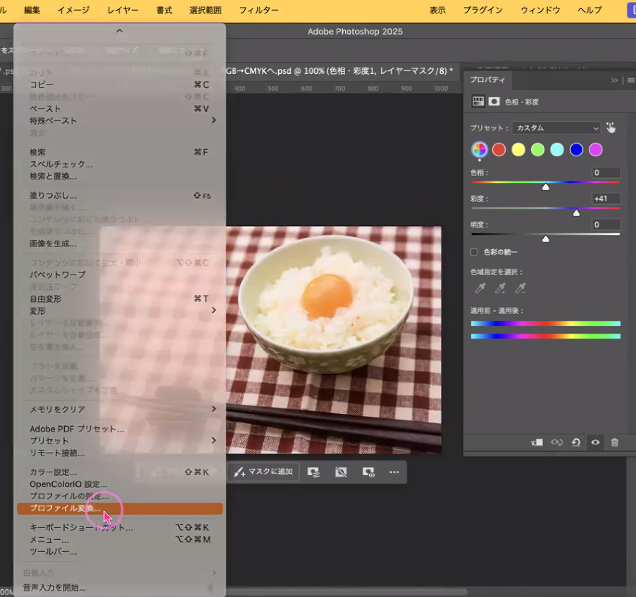 プロファイル変換でRGBからCMYKへの変換を行い別名保存する。この方法で変換すると比較的くすみが少なく変換できる。