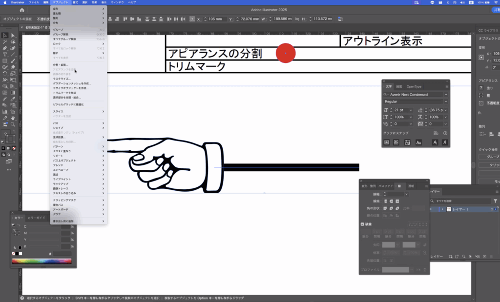 〇や▢などの型抜きしたい形のオブジェクトを作成し、そのオブジェクトのレイヤーを一番下にする。型抜きのオブジェクトを右クリックして「クリッピングマスクを作成」を選択する。