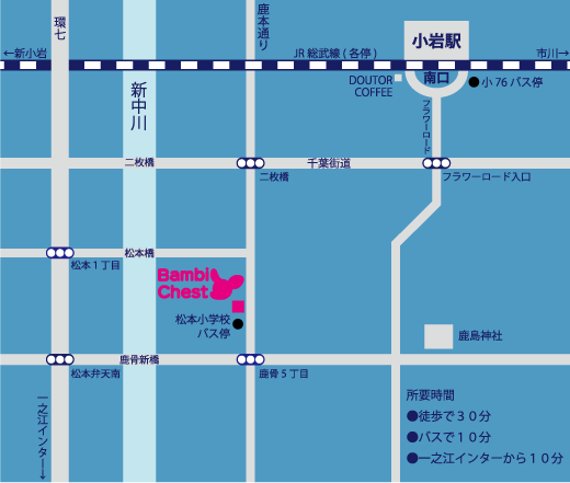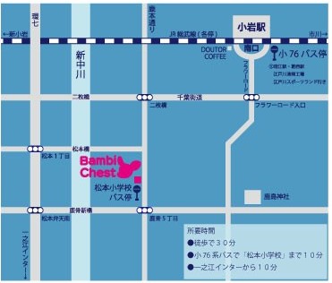 徒歩に時間がかかる為、バスで行くルートをわかりやすくすると良い。例えば、バス停の名前を大きくしたり、バス停のマークを使用したりする。