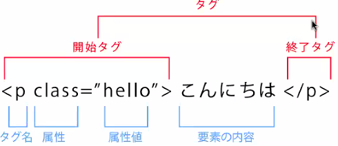 <要素名 属性=”属性値”>内容(コンテンツ)</要素名>