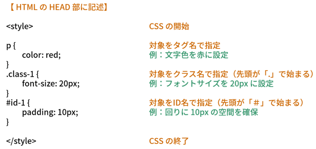 HTML ファイル内に CSS を記述する時は、HTML ファイルの head タグ内(</head>の直前が良い)に以下の記述を行う。