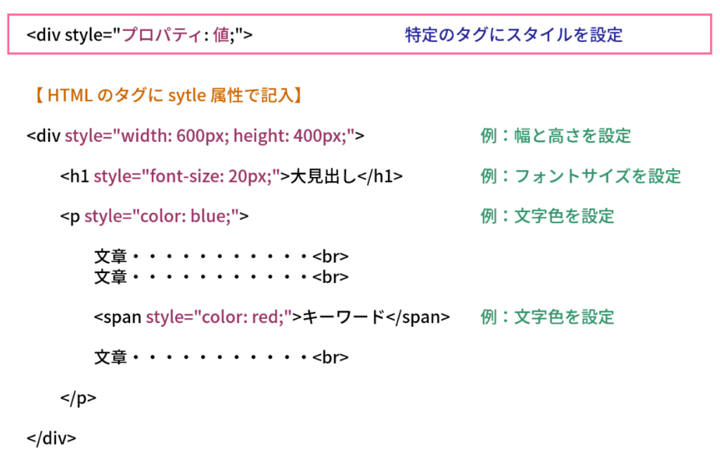 HTML タグにインラインで記述する時は、スタイル(style)属性を使用して以下の記述を行う。