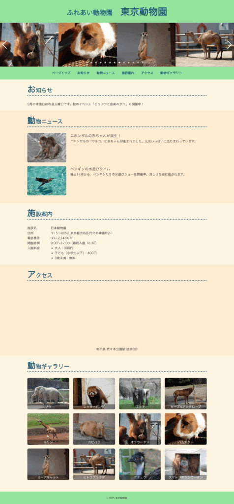 先生が用意してくださったCSSのテンプレートを使用して制作したサイト画面
