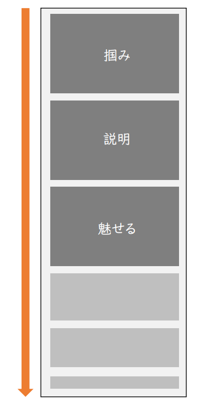 LP(ランディングページ)は、上から下にWebページを見せていく。ポイントは、上から順番に「掴んでいく」 「伝えていく」 「魅せていく」である。