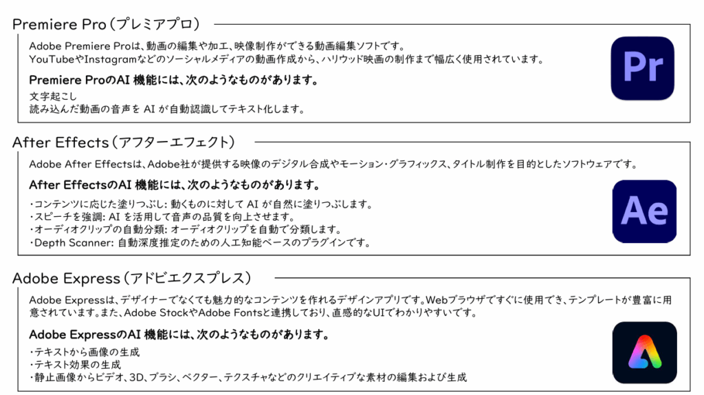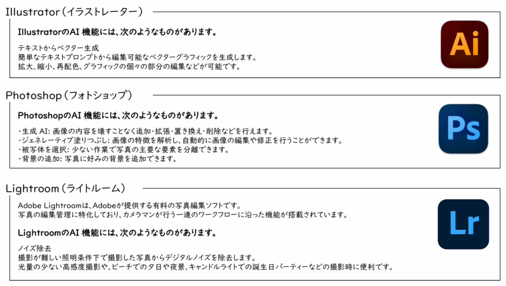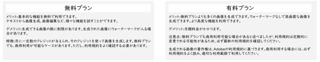 Fireflyが生成する画像はAdobe stockからの画像なので権利的な問題が確認しやすいですが、Firefly以外の生成AIはネットから集めた画像で生成する為、著作権に注意して使用しなければいけません。