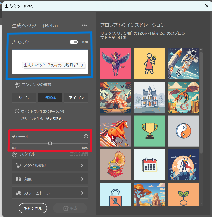 - プロンプトを入力: 図形を選択した状態で、コンテキストタスクバーに表示される「生成」ボタンをクリックし、生成したい内容をテキストで入力します。