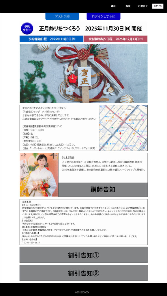 ●割引告知はワークショップの割引と資材商品の割引の2種類が考えられた為、2つ用意しました。